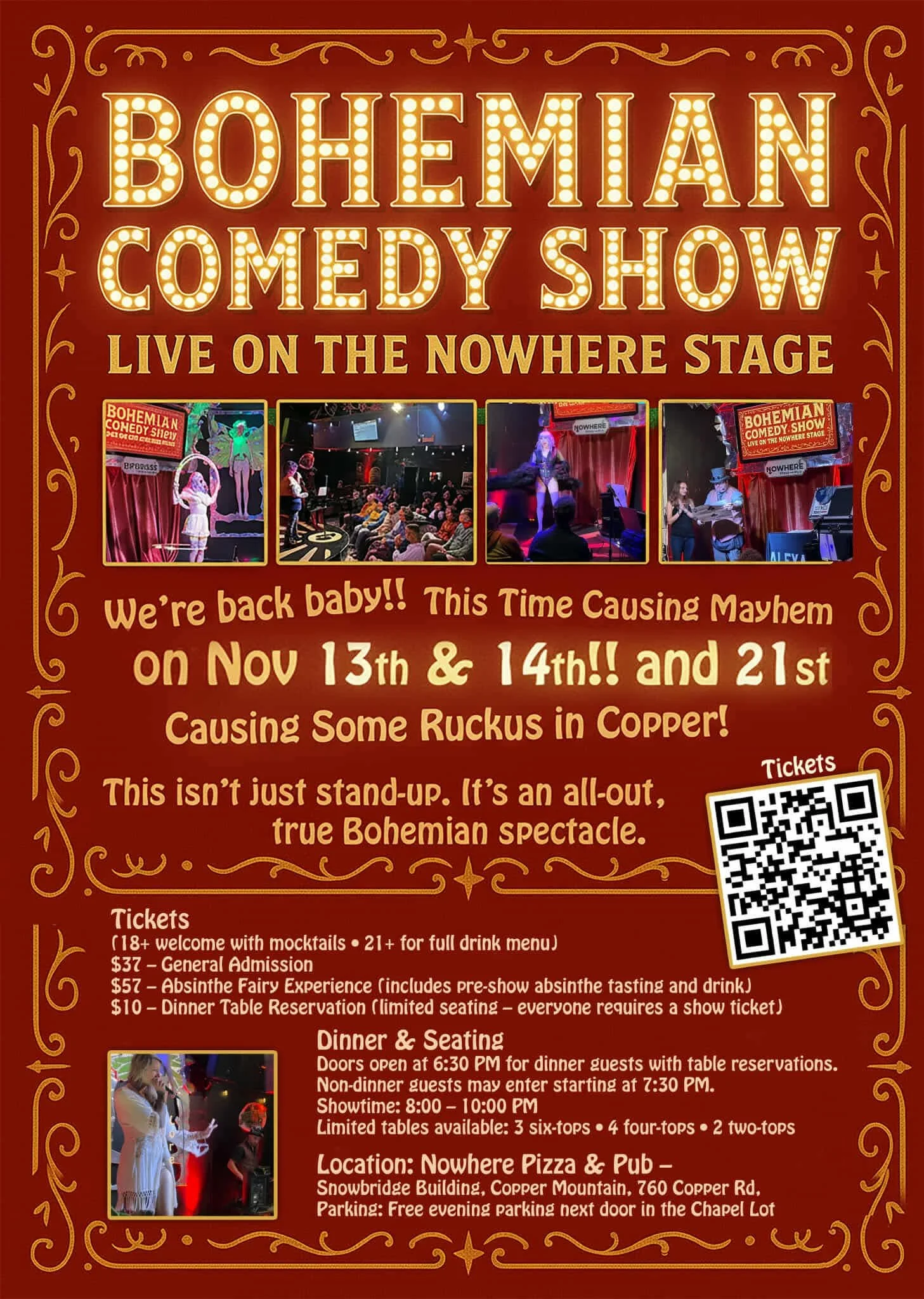 Nowhere Pizza (map) 760 Copper Road Frisco, CO, 80443 United States ✚ gCal ✚ iCal Nowhere Pizza’s Bohemian Comedy Show is back. This isn’t just stand-up. It’s an all-out, true Bohemian spectacle. Orange peel is performing comedy music for the occasion.GET TIXImage: Daniel McEnrue